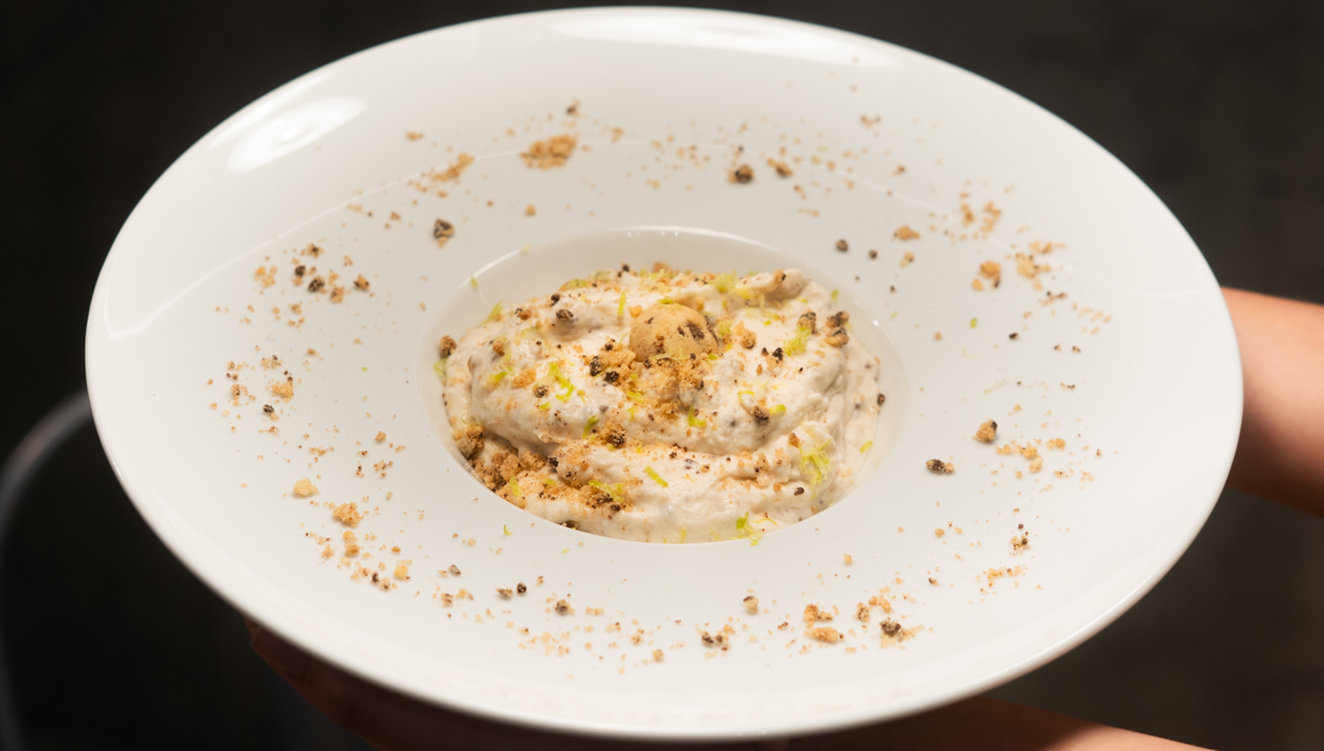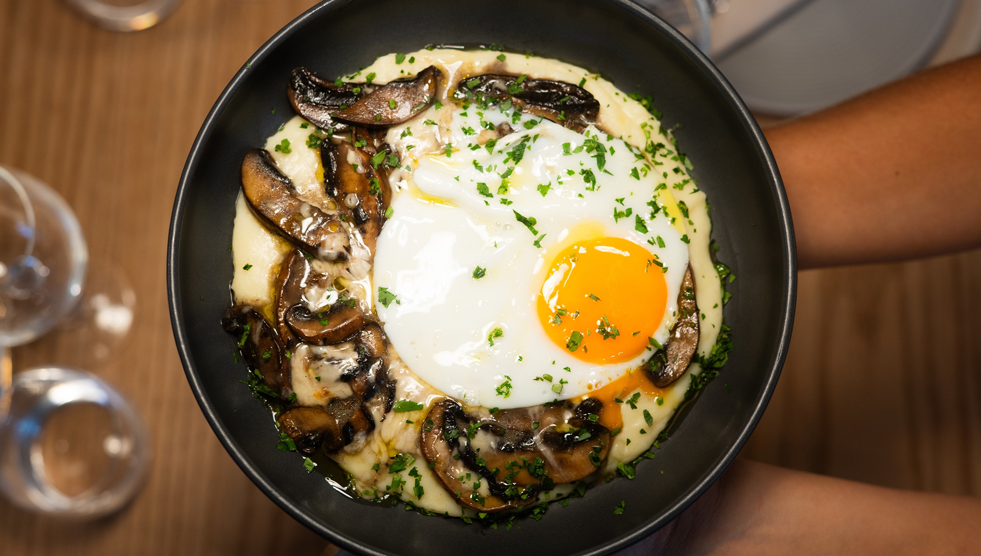 Ovos glaceados; puré trufado, cogumelos; mozzarella, raspas de trufa